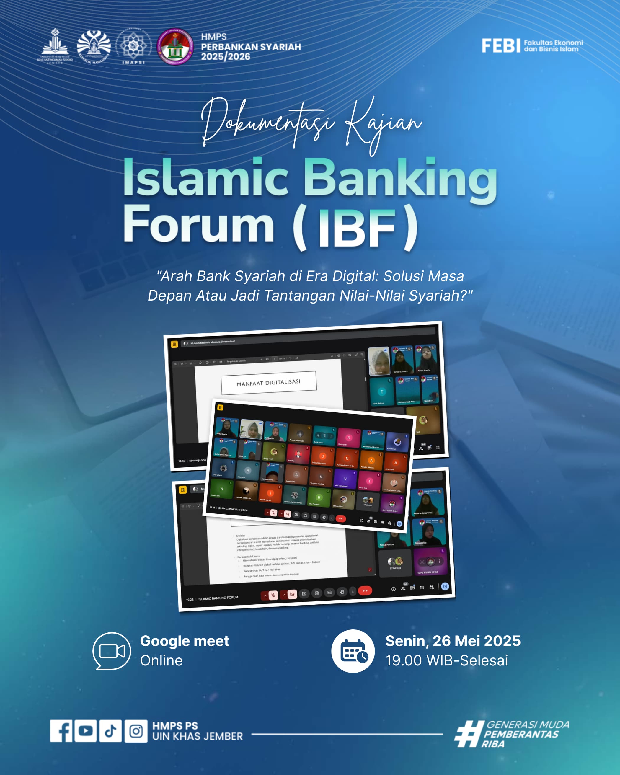 Jember, 26 Mei 2025 — Himpunan Mahasiswa Program Studi (HMPS) Perbankan Syariah Fakultas Ekonomi dan Bisnis Islam (FEBI) UIN Kiai Haji Achmad Siddiq (KHAS) Jember sukses menggelar kegiatan Islamic Banking Forum secara daring melalui platform Google Meet. Forum ilmiah ini mengangkat tema “Arah Bank Syariah di Era Digital: Solusi Masa Depan atau Menjadi Tantangan Nilai-Nilai Syariah” dan bertujuan untuk meningkatkan pemahaman mahasiswa terhadap isu-isu terkini dalam perbankan, perekonomian, dan keuangan syariah.