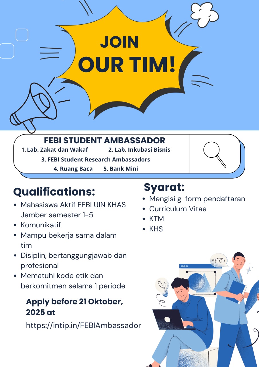 Laboraturium Fakultas Ekonomi dan Bisnis Islam membuka kesempatan bagi mahasiswa aktif FEBI UIN KHAS Jember semester 1–5 untuk menjadi bagian dari tim penggerak akademik, riset, dan inovasi kampus. Pendaftaran dibuka hingga 21 Oktober 2025. Klik link pendaftaran di bawah ini:
